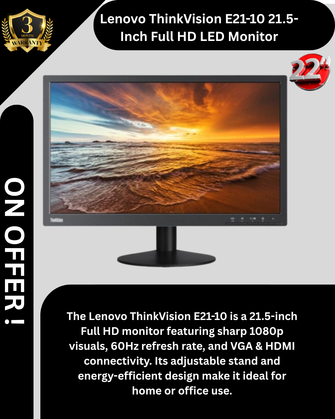 Lenovo ThinkVision E21-10 21.5-Inch Full HD LED Monitor – 1920x1080 Resolution, 60Hz Refresh Rate, Wide Viewing Angles, Anti-Glare Display, VGA & HDMI Connectivity, Adjustable Tilt Stand, Ultra-Slim